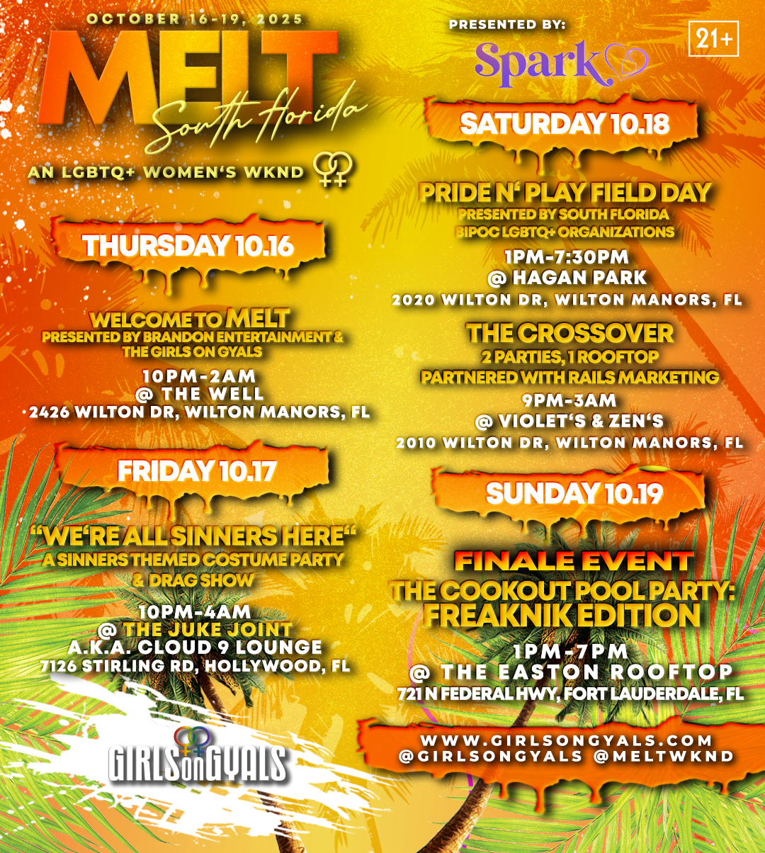 Melt Wknd is the newest 21+ event weekend by Girls on Gyals, powered by Mrly Entertainment It takes place from Thursday, October 16th through Sunday, October 19th, 2025 in Fort Lauderdale, Florida.